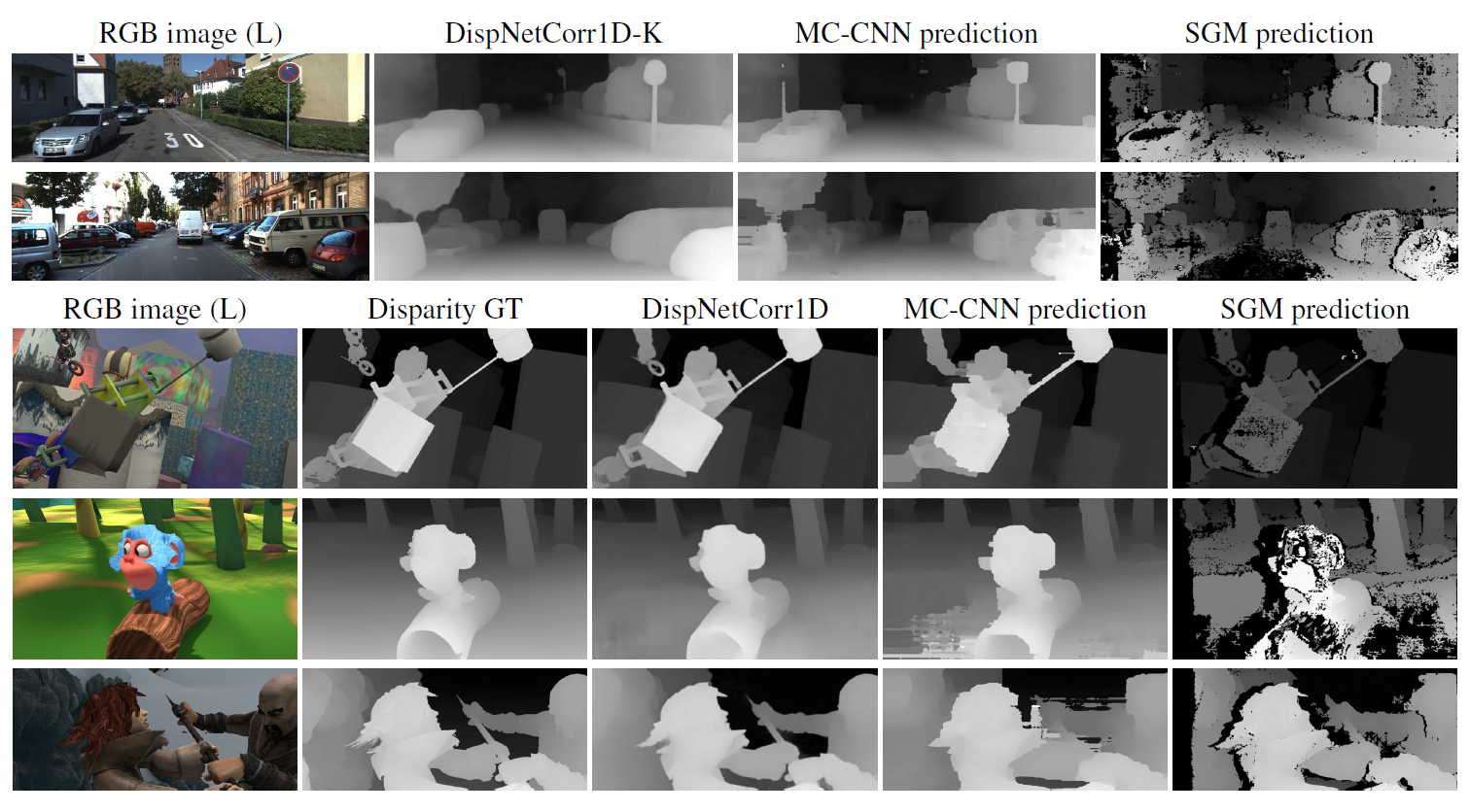 文中比较了Zbontar&LeCun的MC-CNN以及opencv中SGBM方法。DispNet是在FlyingThings3D数据集上做得训练,然后在KITTI 2015数据集上做了优化,注意“K”表示优化之后的网络。