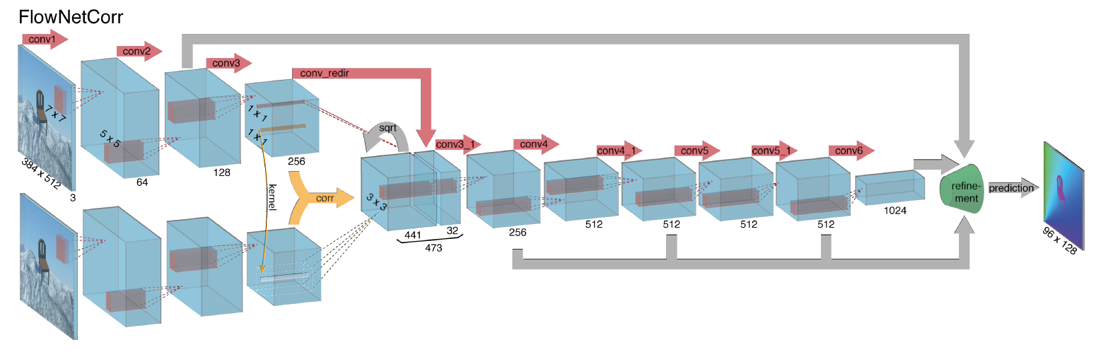 3. 放大部分比Flownet多做了一次deconv,使输出为原来的\(1/2\)。 注意:DispNet对应于FlowNet的第一种实现,DispNetC对应于FlowNet的第二种实现;