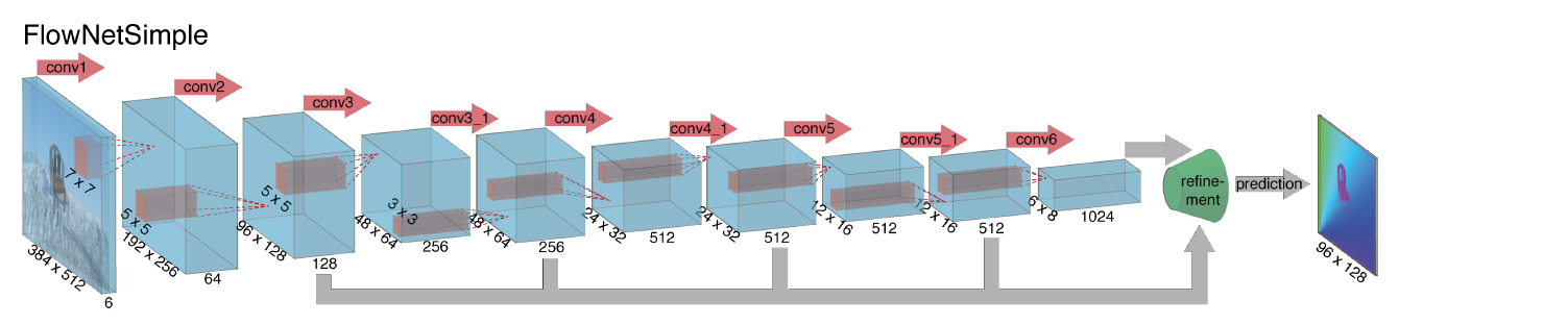 作者受到“per-pixel prediction tasks”的相关工作的启发,设计了两种光流网络框架。一种是相对简单的实现:首先将输入的图像对叠加起来作为输入,然后输入一个网络,让网络自己学,最后提取运动信息。