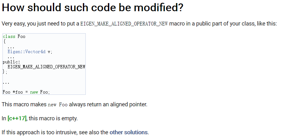 有没有觉得似曾相识?Eigen对该问题的解决方案与我们不谋而合(EIGEN_MAKE_ALIGNED_OPERATOR_NEW)。这当然不是巧合,事实上,本文的灵感正是来源于Eigen。但Eigen只告诉了我们应该怎么做,没有详细讲解其原理。本文则从问题的提出,到具体的解决方案,一一剖析,希望可以给大家一些更深的理解。