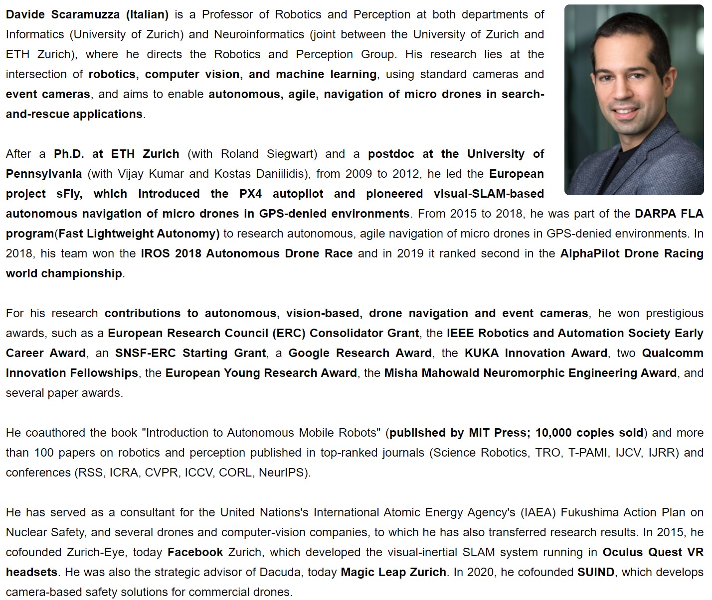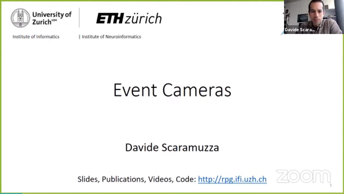ETHZ RPG实验室7的带头人 Davide Scaramuzza4 教授带来了关于事件相机原理以及应用方面的主题演讲(大致看了下Slides,基本上还是CVPR 2019年的内容)。Davide教授在事件相机研究方面做了大量工作,但由于时间有限,Davide教授仅介绍了约50min。但是值得注意的是,RPG实验室在另外一个会场组织了"CVPR 2021 Workshop on Event-based Vision"6,这个研讨会召集了事件视觉方向的研究学者,非常详尽地介绍了基于事件视觉的最新进展,感兴趣的同学可以关注下这个主题。