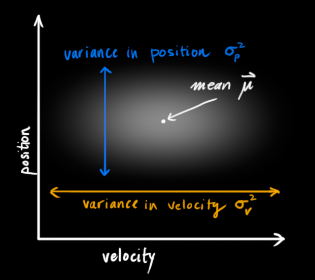 某个时刻,我们不知道真实的位置与速度到底是多少,二者存在一个所有可能性的组合,大致如下图所示。