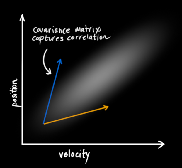 这种状态量的相关性可以由协方差矩阵表示。简而言之,矩阵\(\Sigma_{ij}\)的每个元素是第i个状态变量和第j个状态变量之间的相关度。(显然地可以知道协方差矩阵是对称的,这意味着您交换i和j都没关系)。协方差矩阵通常标记为“ \(\Sigma\)”,因此我们将它们的元素称为“\(\Sigma_{ij}\)”。