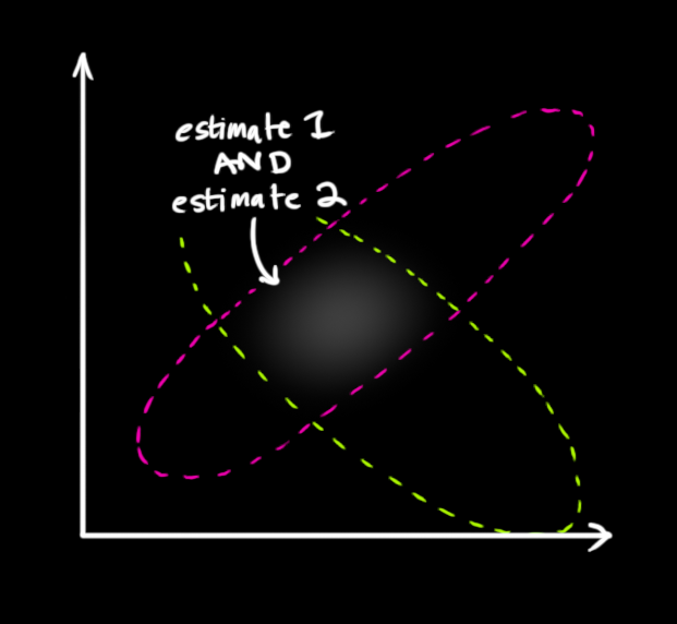 我们有两个高斯分布,一个是我们预测的观测\((\color{fuchsia}{\mu_0}, \color{deeppink}{\Sigma_0}) = (\color{fuchsia}{\mathbf{H}_k \mathbf{\hat{x}}_k}, \color{deeppink}{\mathbf{H}_k \mathbf{P}_k \mathbf{H}_k^T})\),另外一个是实际的观测(传感器读数)\((\color{yellowgreen}{\mu_1}, \color{mediumaquamarine}{\Sigma_1}) = (\color{yellowgreen}{\vec{\mathbf{z}_k}}, \color{mediumaquamarine}{\mathbf{R}_k})\),我们将这两个高斯分布带入公式\(\eqref{matrixupdate}\)中就可以得到二者的重叠区域: