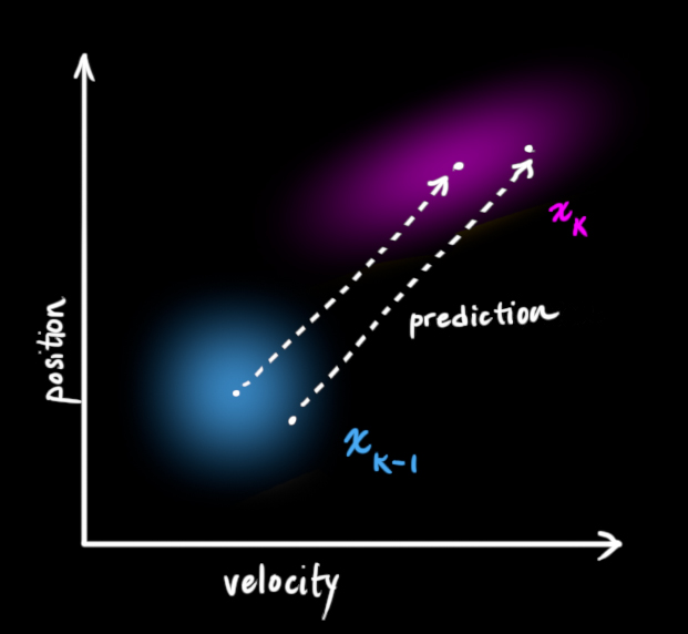 接下来,我们需要某种方式来查看当前状态(\(k-1\)时刻)并预测在时刻\(k\)处的状态。请记住,我们不知道哪个状态是“真实”状态,但是我们提到的预测(prediction)并不在乎这些。