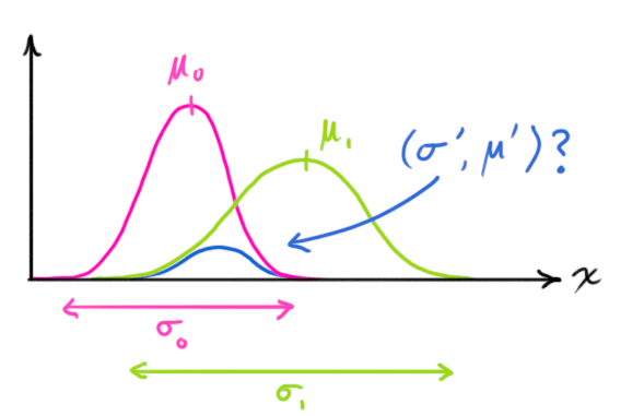\[\begin{equation} \label{gaussequiv} \mathcal{N}(x, \color{fuchsia}{\mu_0}, \color{deeppink}{\sigma_0}) \cdot \mathcal{N}(x, \color{yellowgreen}{\mu_1}, \color{mediumaquamarine}{\sigma_1}) \stackrel{?}{=} \mathcal{N}(x, \color{royalblue}{\mu’}, \color{mediumblue}{\sigma’}) \end{equation}\]