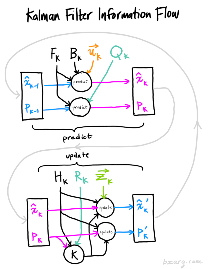 \[\begin{equation} \begin{split} \color{royalblue}{\mathbf{\hat{x}}_k’} &= \color{fuchsia}{\mathbf{\hat{x}}_k} & + & \color{purple}{\mathbf{K}’} ( \color{yellowgreen}{\vec{\mathbf{z}_k}} – \color{fuchsia}{\mathbf{H}_k \mathbf{\hat{x}}_k} ) \\ \color{royalblue}{\mathbf{P}_k’} &= \color{deeppink}{\mathbf{P}_k} & – & \color{purple}{\mathbf{K}’} \color{deeppink}{\mathbf{H}_k \mathbf{P}_k} \end{split} \label{kalupdatefull} \end{equation}\]
