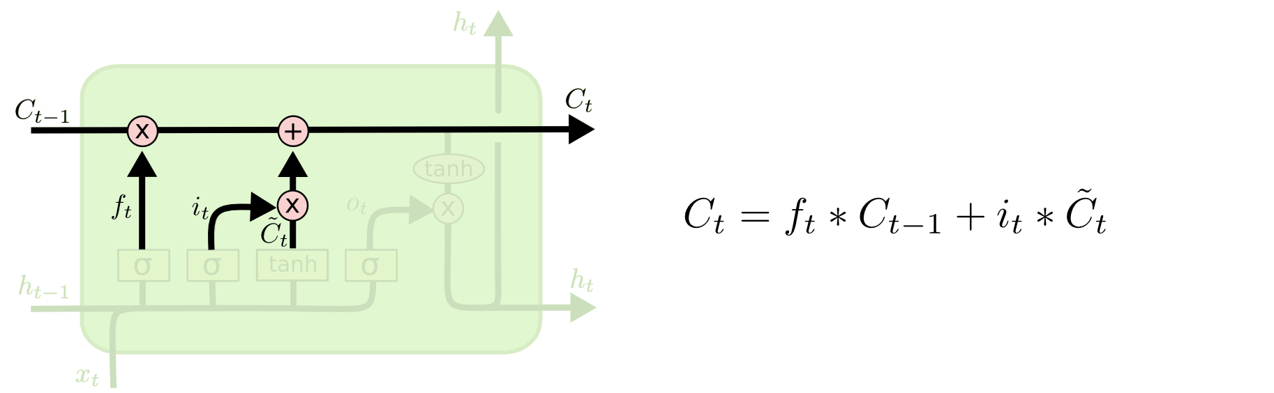 我们现在更新旧的细胞状态,从状态\(C\_{t-1}\)到状态\(C\_{t}\)。上述步骤已经详述了具体如何操作,我们现在就开始更新! 我们将旧的细胞状态乘以\(f_t\),目的是忘记我们要忘记的旧状态。然后我们加上\(i_t*\tilde{C}_t\),这就是我们创造新的候选值,这个值根据我们想要更新每个状态值的程度进行伸缩变化(这就是\(i_t\)的意义)。 在我们的语言模型中,这就是我们根据最开始确定的目标,丢弃旧主语性别以及增加新主语信息的地方。