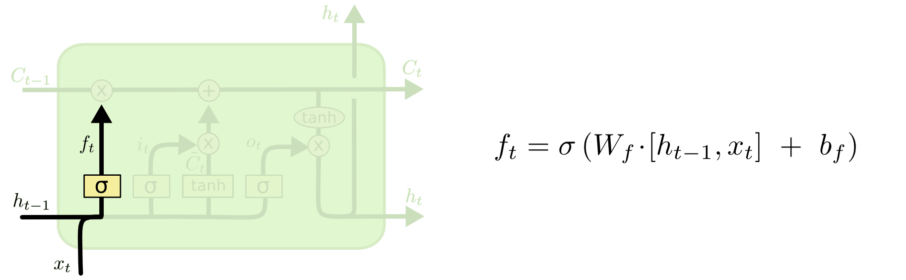 LSTM的第一步是来决定啥信息将要从细胞状态中丢弃。这个决定是由一个叫做“遗忘门”(“forget gate layer”)的\(sigmoid\)层来决定。它的输入是\(h\_{t-1}\)\(x\_t\),输出是一个介于\(0\)\(1\)之间数值,给每个在状态\(C\_{t-1}\)的数值。\(1\)表示“完全保留”,\(0\)表示“完全丢弃”。 让我们回到之前的的语言模型的例子中,我们还是基于以前的词语来预测后续的单词。在这样一个问题中,细胞状态可能会包含当前主语的性别信息,所以正确的介词将会被使用。当我们看到一个新的主语时,我们要遗忘掉旧的的主语。