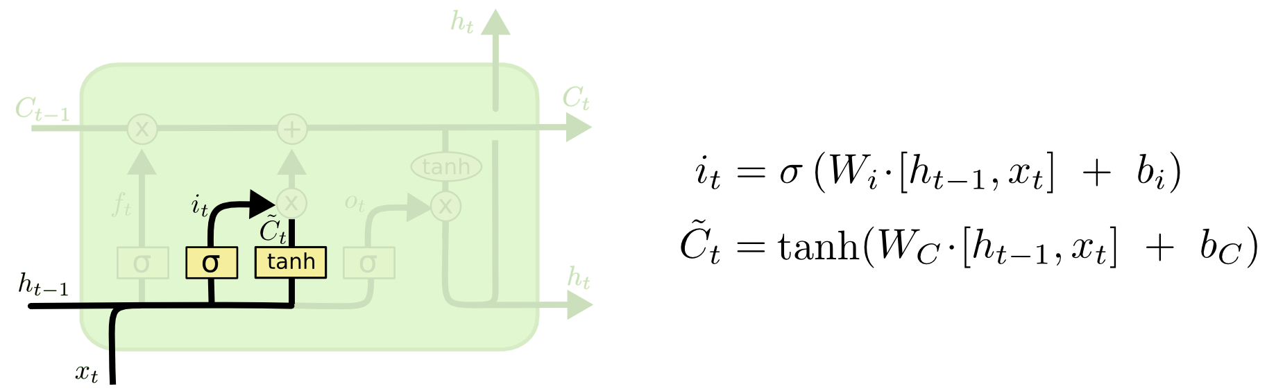 下一步就是决定啥新信息将要存储在细胞状态中。这包括两个方面。第一,一个叫做“输入门层”的\(sigmoid\)层来决定哪些值我们要更新;第二,一个\(tanh\)层创造了新的候选值\(\tilde{C}_t\),这个值将会加入到新的状态中去。进一步,我们要把上述两个方面结合起来来更新细胞状态。 在我们的语言模型中,我们想要在新的主语对应的细胞状态中加入性别信息,去代替我们遗忘掉的那个旧主语状态。