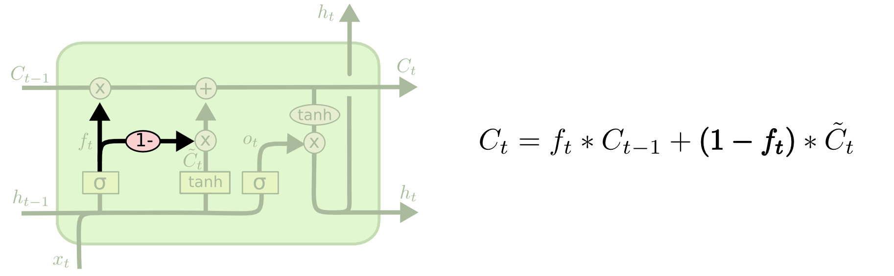 另外一种变体是加入了双遗忘门(coupled forget)以及输入门。我们同时考虑了何时遗忘以及应该加入何种新信息,而并非分别考虑。我们仅仅在我们需要就地输入信息的时候才会遗忘,同时我们仅仅在遗忘掉旧的信息的时候才会加入新的信息(译者:此时\(f_t=0\),表示遗忘旧的细胞状态,同时加入新的输入\(\tilde{C}_t\))。