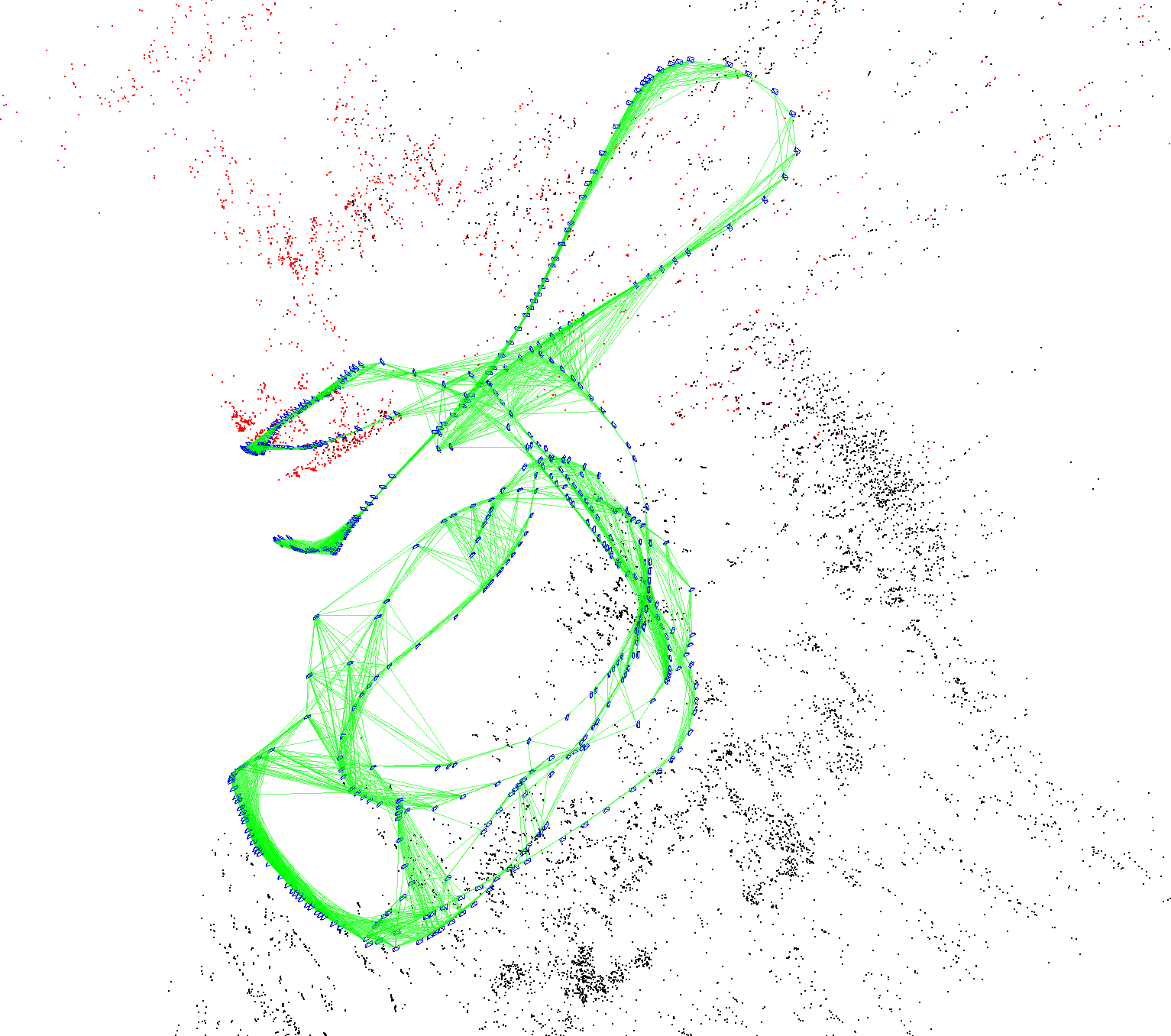 • 相似性变换计算:考虑到单目SLAM的尺度漂移,当前帧和回环帧之间的相对位姿应是一个相似变换,并且,二者之间应具有足够多的匹配点。该模块主要是通过循环计算当前帧和上述经过筛选后的候选关键帧之间的相似变换,直到找到一个和当前帧具有足够多匹配点的相似变换,对应的候选关键帧即为最终的回环帧。