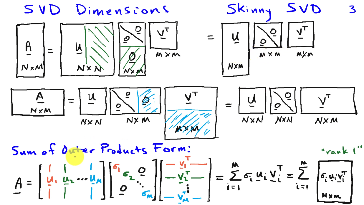一张图可以解释了,上面介绍的SVD形式为skinny SVD 或者 thin SVD,即仅保留了奇异值矩阵 \(\Sigma\) 的非零元素所在的部分,所以它的形状是个方阵。而full SVD保留了奇异值矩阵的非零部分,对应的 \(U\)\(V\) 为方阵。