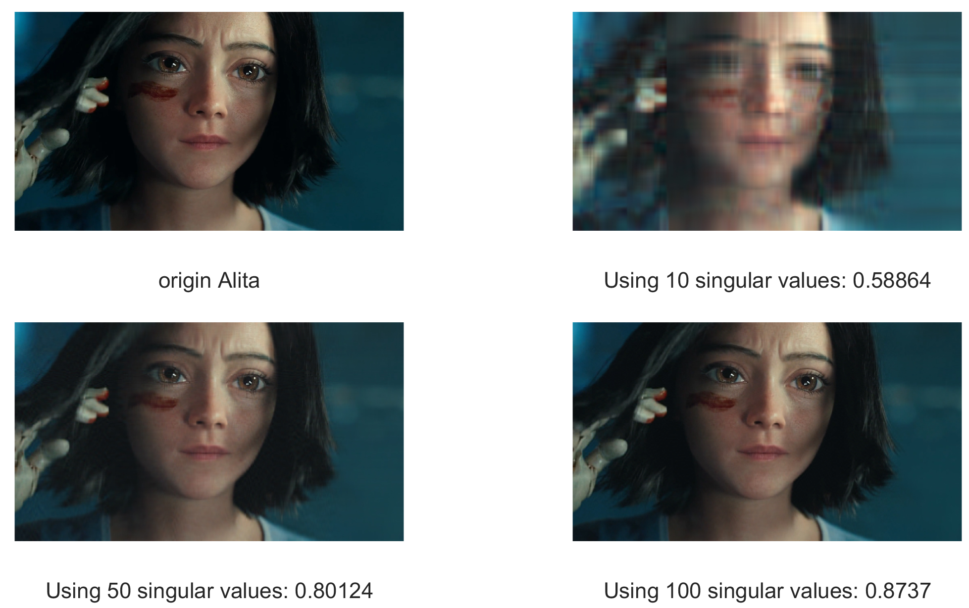下图是保留的奇异值数量与图像质量的关系图,保留的奇异值越多,图像质量越高,图像压缩效果越不明显;反之,奇异值越少,图像质量越差,图像压缩效果越明显。这只是一种非常简单的图像压缩算法,仅作原理验证使用,在实际中用到的概率不是很大。