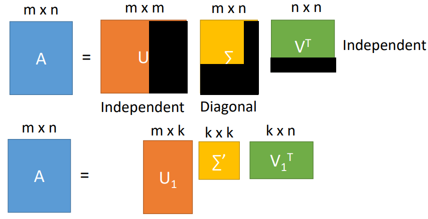 其中\({\sigma}_1 \geq {\sigma}_2 \geq ... {\sigma}_k > 0\),将\(\Sigma\)中主对角线为0的部分删去,同样的\(U,V\)对应的部分删去,SVD分解就变成了下图的形式。