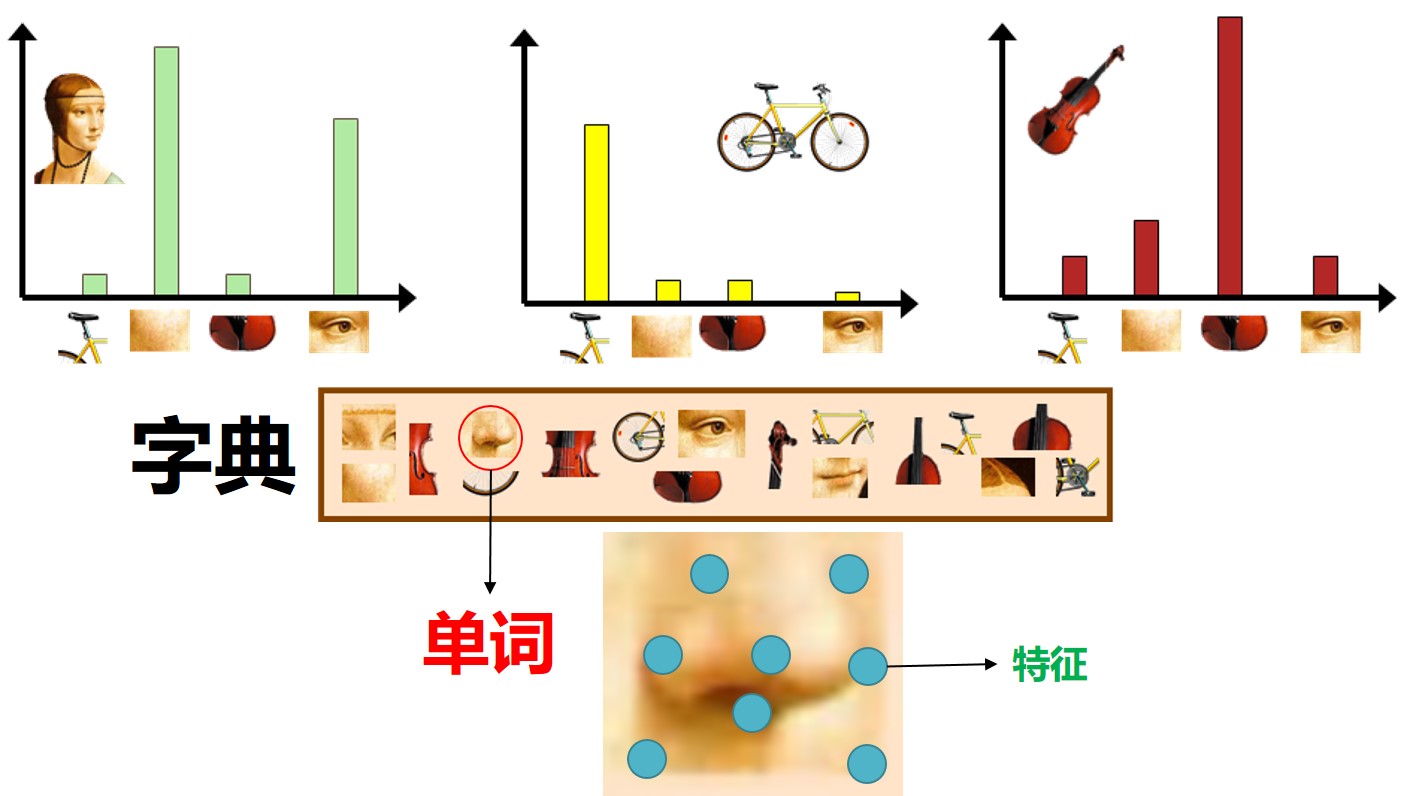 BoW: Bag of Words,中译“词袋”,BoW算法即Bag of Words,本是用于文本检索,后被应用于图像检索,和SIFT等出色的局部特征描述符共同使用(所以有时也叫Bag of Feature,BOF),表现出比暴力匹配效率更高的图像检索效果,它是直接使用K-means对局部描述符进行聚类,获得一定数量的视觉单词,然后量化再统计词频或TF-IDF加权之后的权重系数。