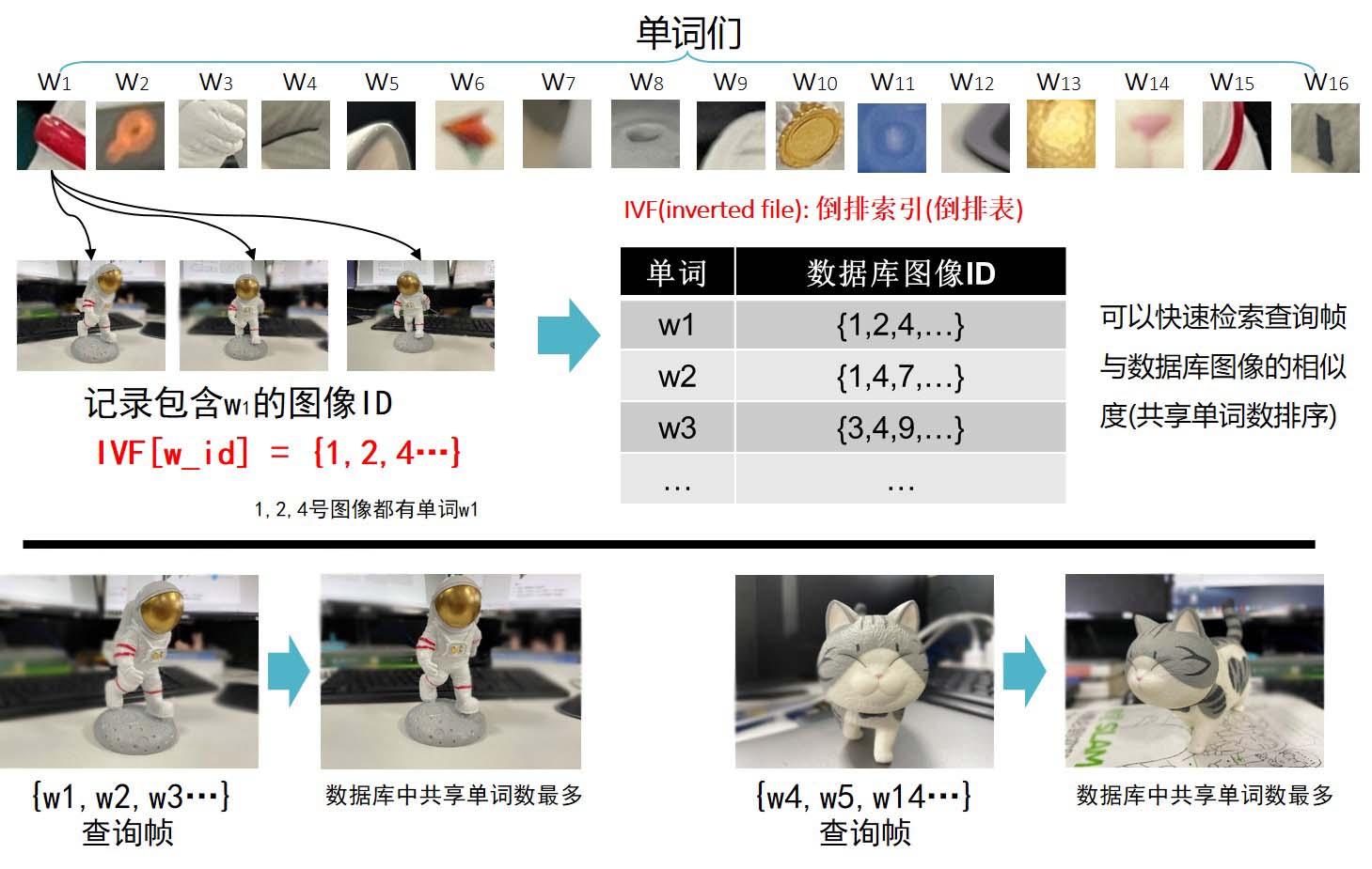 倒排索引记录了单词与图像之间的对应关系,即\(IVF[w_{id}] = {I_{i}}\),如对于单词\(w_1\),图像\({1,2,4...}\)都有单词\(w_1\)。于是在进行图像检索时,我们可以统计查询图像与数据库图像之间的共享单词的个数,共享单词数量多的数据库图像就是与查询图像“相似”的图像。整个过程中并没有进行图像匹配,仅以统计的方式得到了图像之间的“相似度”,这个过程是非常快速的,因而在SLAM中的重定位/闭环时经常使用。