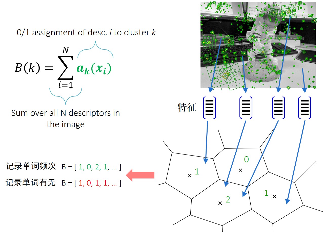 在计算词袋向量之前,我们需要一个训练好的字典(稍后介绍)。对于输入图像,提取SIFT特征,这里的特征指的是特征点及其对应的描述子,计算词袋向量需要的是描述子。我们在字典中查找特征描述子所在的单词,然后在该单词的频次上计数+1,图像上所有特征的描述子找到其对应单词后也就得到了单词出现频次的计数值,我们可以将这个频次称为词袋向量,维度为单词的个数。如上图所示,图像有4个特征,统计特征对应字典种单词出现的频次,这样可以得到该图像的“词袋”向量\(\mathbf{B} = [1,0,2,1,...]\),或者我们仅仅保留单词有无出现过,这样可以得到二值化的词袋向量\(\mathbf{B} = [1,0,1,1,...]\)