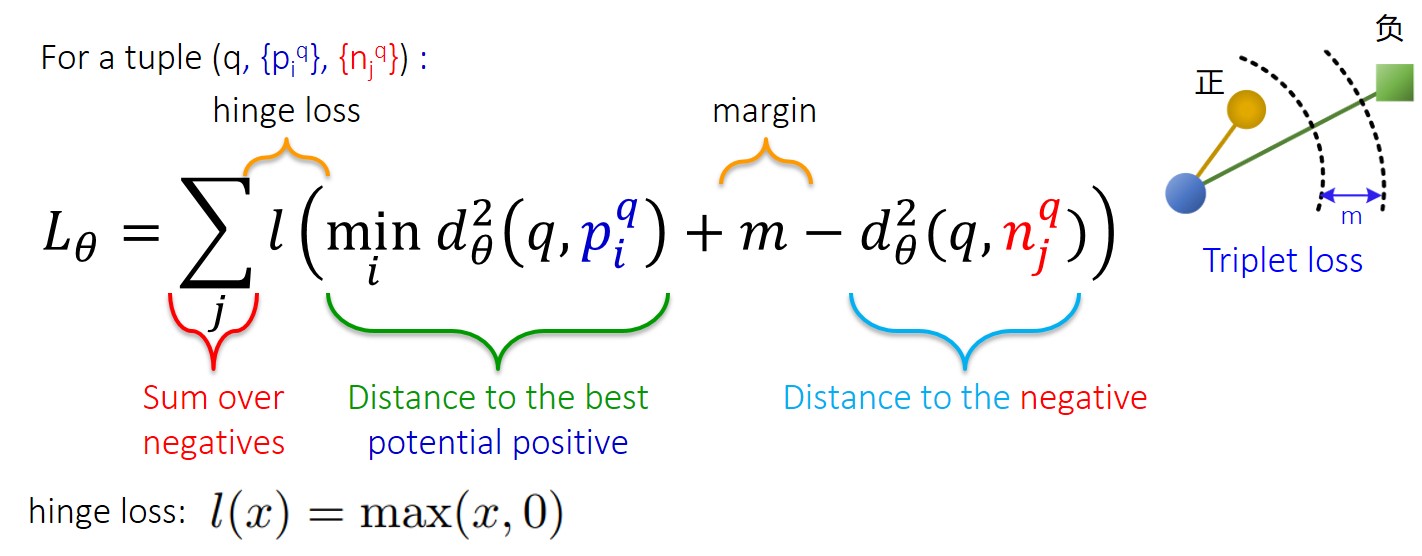 目标:学习一个网络使得查询帧与正例之间的最小距离\(d_1\)要小于查询帧与所有负例之间的距离\(d_2\)。但仅仅 \(d_2 - d_1 > 0\) 并不够,还要求\(d_2\)\(d_1\) 大上一段距离,这个距离为上式中的\(m\)。所以,当$d_2 – d_1 < m $ 时,这说明网络还不足以区分正、负例,我们要惩罚这种现象(即,此时的\(l(x) = x\));对应的,当\(d_2 – d_1 \geq m\) 时,网络可以区分正、负例,此时的惩罚为0。