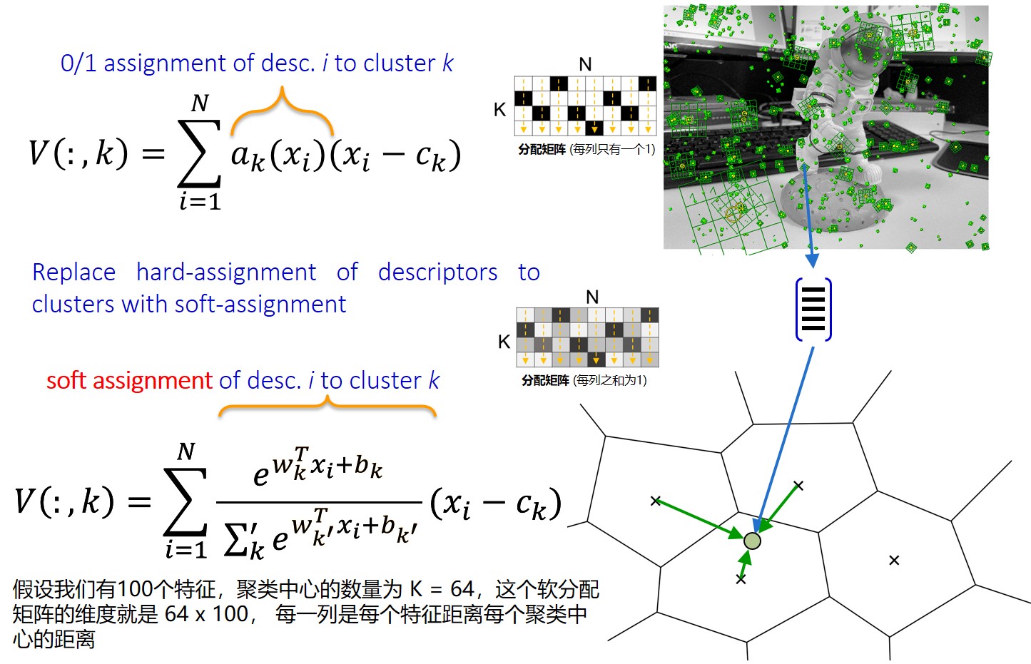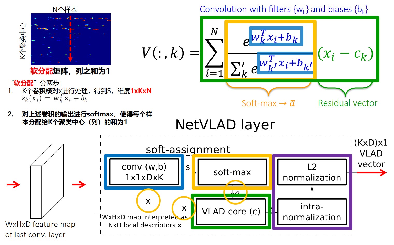 NetVLAD是对VLAD的进一步改进,使用softmax到单词的对应关系从hard assignment转换成soft assigment(软分配矩阵),遂将VLAD变成了一个学习的过程。