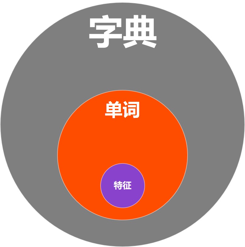 • 一个“单词”底下”挂着” 很多“特征”(可以想象,这些特征因“长得像”所以分在了一个单词下)