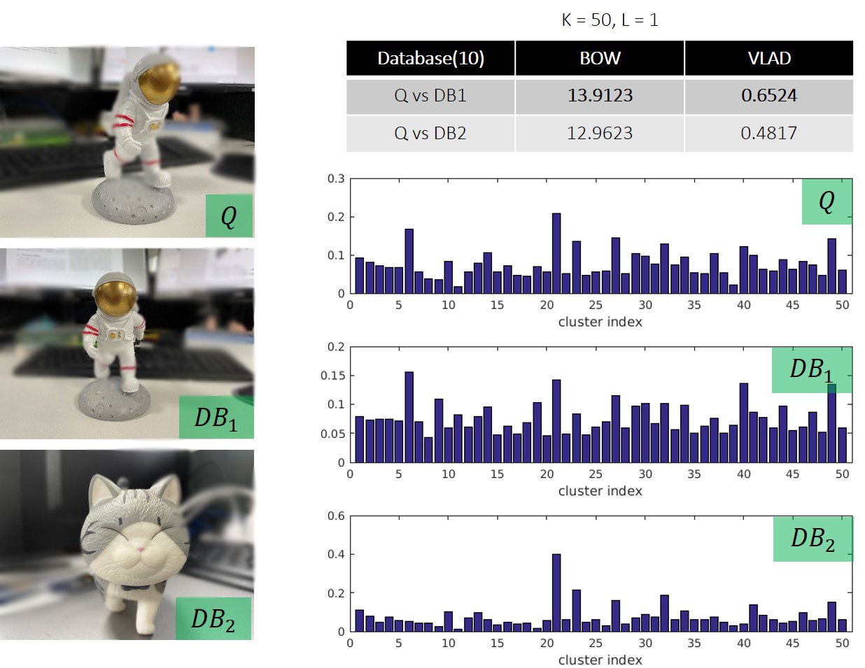 下图是查询图与数据库中两张图像的相似度对比。其中\(K = 50, L = 1\)表示,聚类中心数量为50,这个字典由50个单词组成,层数为1。另外,参与训练字典的图像数量为10。通过主观观察可以明显地看到查询图\(Q\)\(DB_1\)相似,与\(DB_2\)不相似;从词袋相似度上可以看到,前者的相似度比后者要高,这说明BoW的有效性。但是二者相似度得分差异并不大,这可能与训练样本数量以及字典层数相关(如何改进?多层+增加训练集合+使用特异性更强的特征点对特征进行描述)。VLAD相似度得分比较位于表格的最后一列,也可以得出\(Q\)\(DB_1\)较为相似的结论。