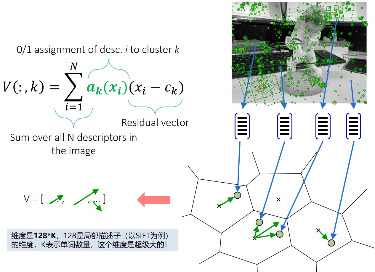 在了解了BoW的计算过程后,VLAD (Vector of Locally Aggregated Descriptor)的计算过程也就非常简单了。VLAD将属于同一个单词的所有特征与单词之间的距离差异(residual vector)累积,得到属于该单词的VLAD向量\(\mathbf{V}(:,k)\)。可以看到,VLAD相较BoW增加了特征与单词之间的距离度量(即保留局部特征与聚类中心的分布差异)。假设单词的数量为\(K\),以SIFT为例,每个特征的描述子维度为128,所以VLAD的维度为\(128 \times K\)。当\(K\)较大时,VLAD的维度是非常大的,通常后续要进行降维操作。